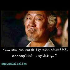 El maestro es la personificación de la sabiduría. Nadie dentro de la película puede enfrentarse al maestro sin ser ridiculizado por éste y nadie fuera de la película (el espectador) puede criticar la sabiduría si no quiere ser considerado después un idiota. Y es que no puedes criticar a quien al final gana haciendo justicia.
